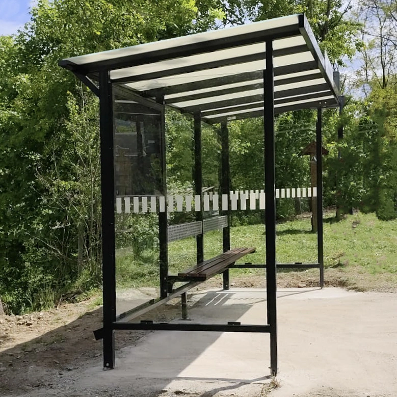 In Stary Sącz we've installed several new shelters – today we present CANIS, a modern powder-coated steel profile structure. The shelter is fully glazed, features a wooden bench and stainless-steel backrest, and includes an integrated notice board on the rear wall. All together in a cohesive, elegant design – that's CANIS!