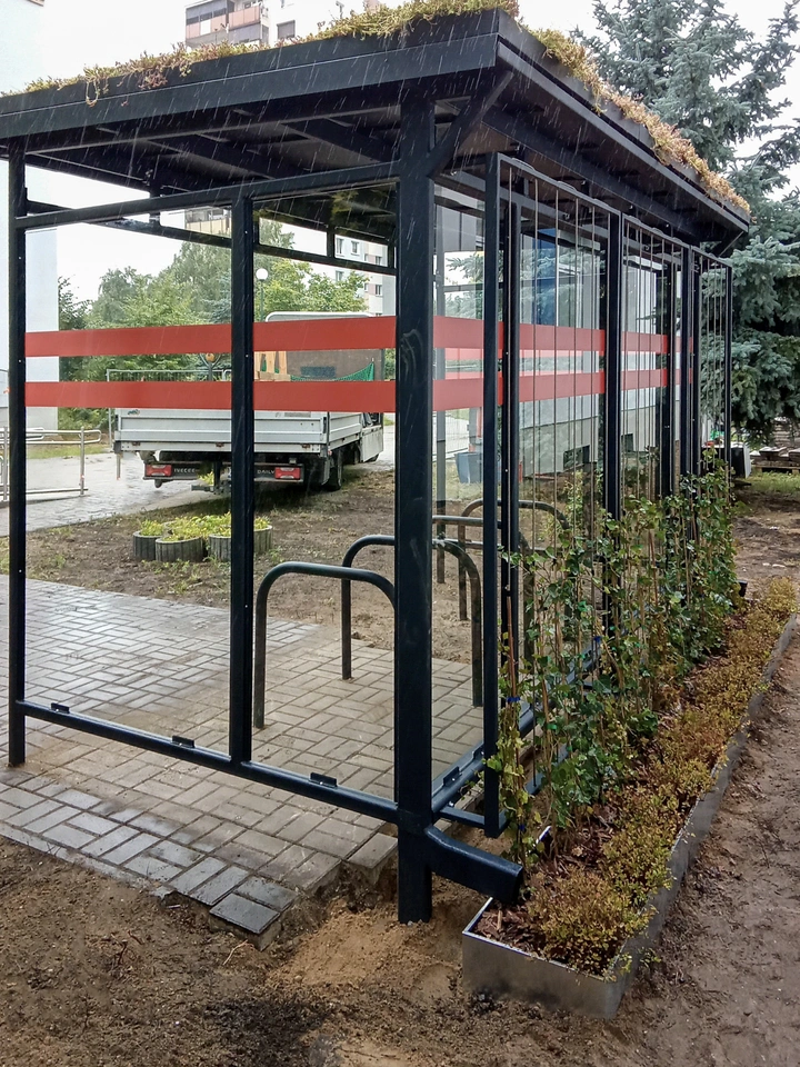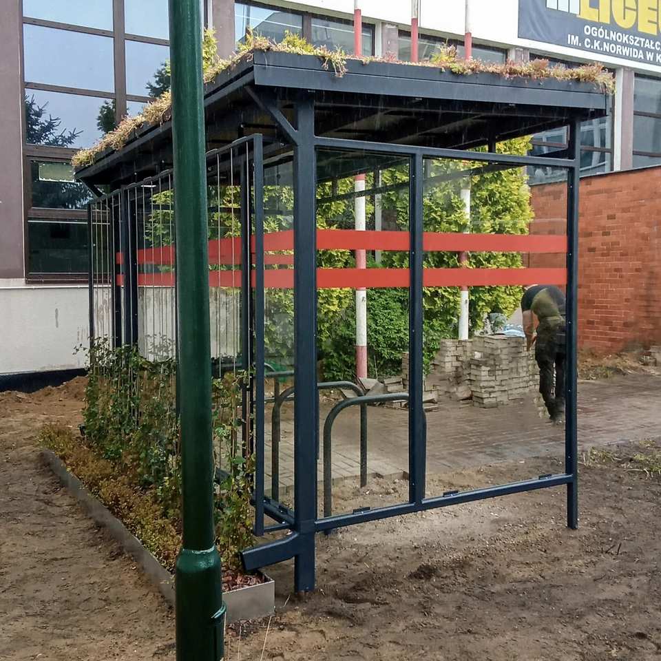 At the 3rd High School in Konin, we installed an innovative bike shelter with a green roof and a planter – a space that not only protects bikes but also brings greenery into the urban setting. Soon, plants will be climbing up the wires, creating a beautiful natural wall.