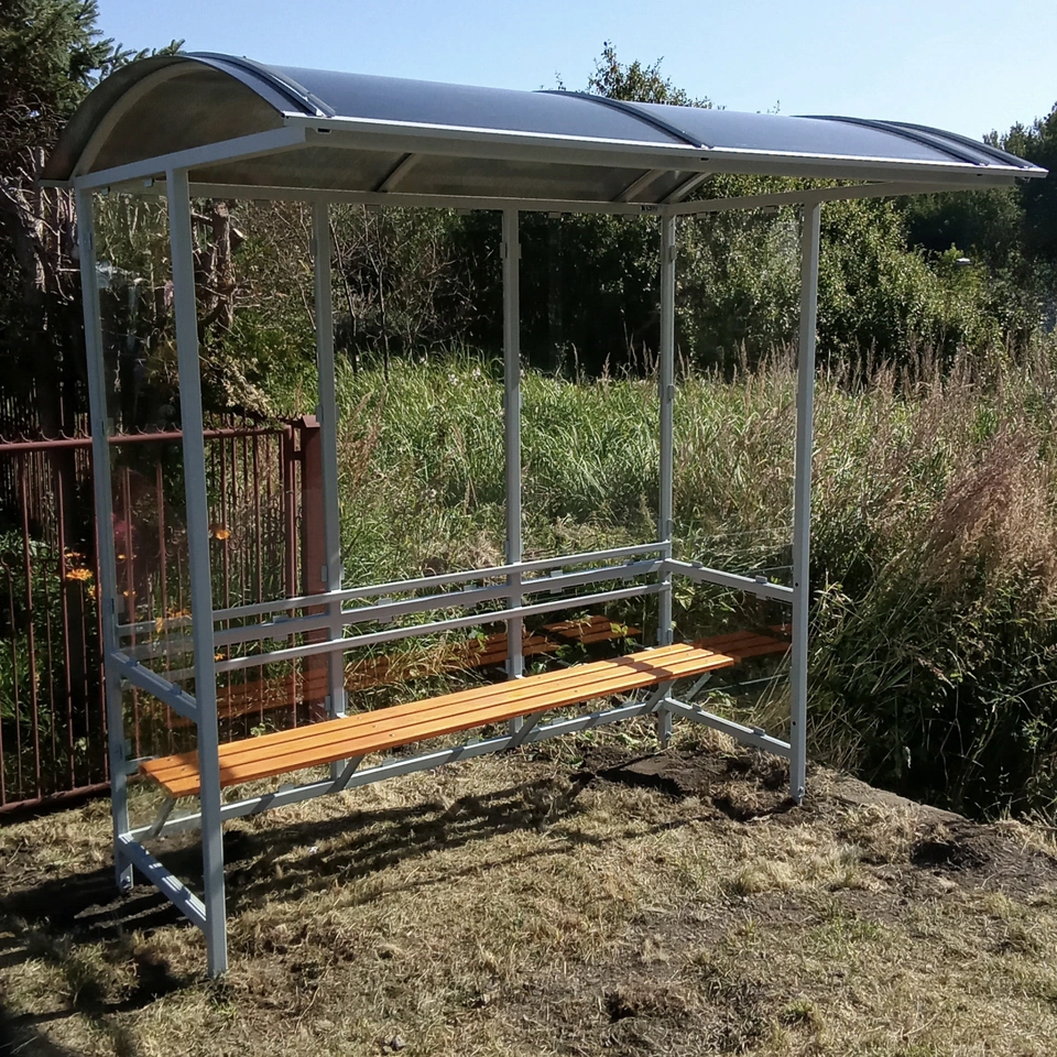 This is a perfect solution for spaces with limited room for a shelter. The GAMMA model features an economical and functional design with a flat arched polycarbonate roof, a wooden bench, and customization options to fit local needs. Learn more about it!