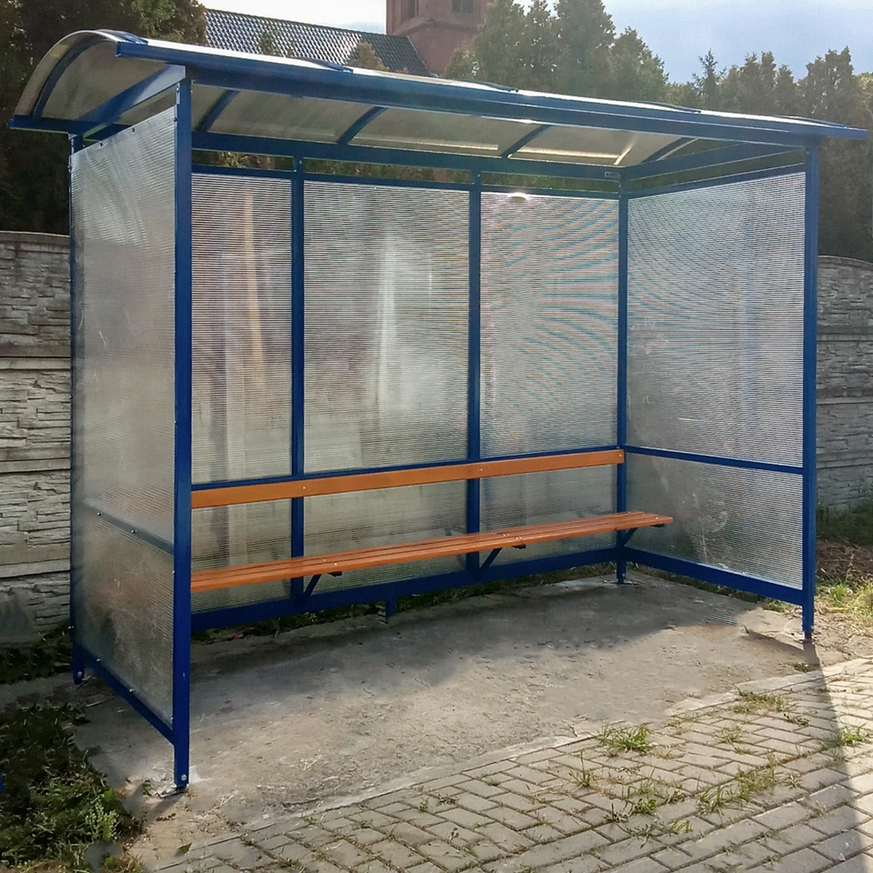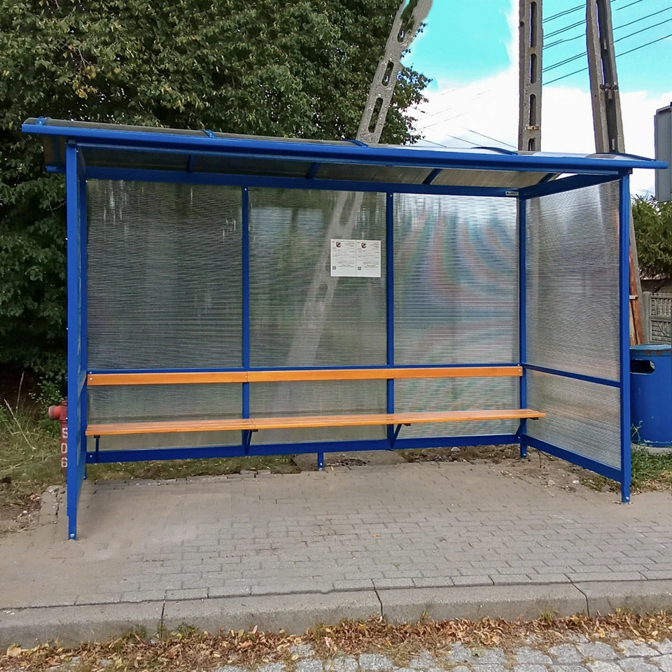 We present an installation in GM. Ozimek a 3-module Gamma bus shelter in a beautiful deep blue color. The shelter features wooden seating and walls and a roof made of honeycomb polycarbonate, ensuring durability and protection against weather conditions. The structure is made from enclosed steel profiles, powder-coated with the option of hot-dip galvanizing, combining solidity with aesthetics. A comfortable and modern solution that fits perfectly into the surroundings of Ozimek municipality.